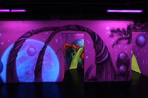 However, the real attractions of the club are at the back, where you will find a miniature golf course and laser tag area. Both are painted with luminous 3D images.