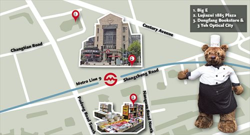 Walking out of exit 2 for five minutes, branches of Dongfang Bookstore (6888-9279) and 3 Yeh Optical City (5131-0168) are both in Lucky Tower at 660 Shangcheng Road. The bookstore occupies the first and second floors, and the optical city the third and fourth.