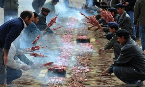 People in the Xinjiang Uyghur Autonomous Region cooking mutton skewers. Photo: CFP