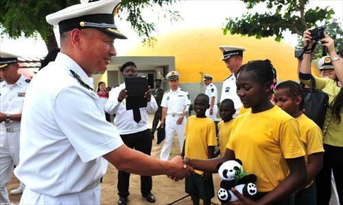 Commander of the task force Li Pengcheng (L) gives a gift to a local kid at the Luanda port, Angola, June 5, 2014. The 16th escort task force of the Chinese navy arrived in Luanda port, Angola on Thursday for a three-day friendly visit, the first of its kind to the African country. (Xinhua/Wang Bingfei)
