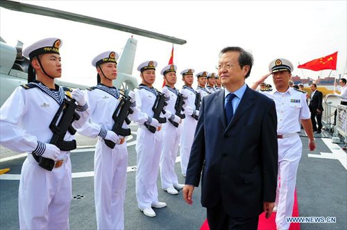 Chinese Ambassador to Luanda Gao Kexiang (2nd R) reviews an honor guard at the accompany of Commander of the task force Li Pengcheng (1st R) aboard missile frigate "Yancheng" at the Luanda port, Angola, June 5, 2014. The 16th escort task force of the Chinese navy arrived in Luanda port, Angola on Thursday for a three-day friendly visit, the first of its kind to the African country. (Xinhua/Wang Bingfei)