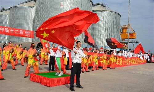 Employees of Chinese companies welcome the Chinese navy fleet at the Luanda port, Angola, June 5, 2014. The 16th escort task force of the Chinese navy arrived in Luanda port, Angola on Thursday for a three-day friendly visit, the first of its kind to the African country. (Xinhua/Wang Bingfei)