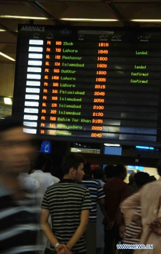 Pakistani passengers gather under flight electronic board at Jinnah International Airport after militants attack in southern Pakistani port city of Karachi on June 9, 2014. The Jinnah International Airport in Pakistan's southern port city of Karachi reopened to passengers on Monday afternoon following Sunday night's terrorist attack that killed 23 people, local media and officials said. (Xinhua/Masroor)