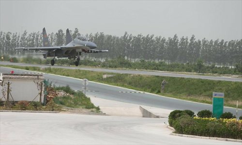 China's air force for the first time test flew warplanes on a highway strip in central China's Henan Province on Sunday, May 25, 2014. Flight tests of military aircraft including the third generation of warplanes were held on the Zhengzhou-Minquan highway, according to the military. Photo: PLA Daily