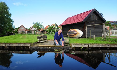 A man works by a canal at the backyard of his home in Giethoorn on May 22. Photo: Wu Gang/GT