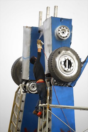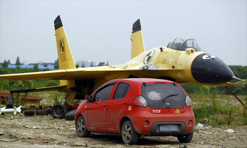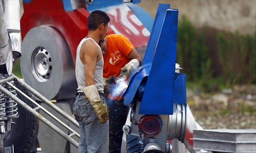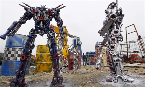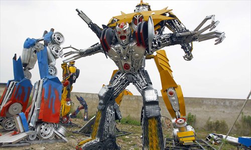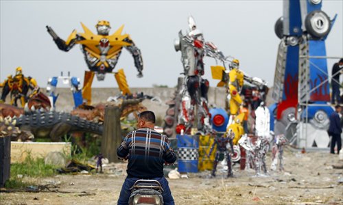 A series of giant Transformer replicas stand outside a small factory on the outskirts of Shanghai on June 18. Li Lei, the factory owner, said he builds the giant replicas from spare machine parts for sale or rent. Li explained orders have skyrocketed in anticipation of Transformers 4: Age of Extinction, which is set to hit screens on June 27. Photos: Yang Hui/GT