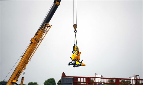 A crane hoists a pair of Transformer legs for an unfinished replica.