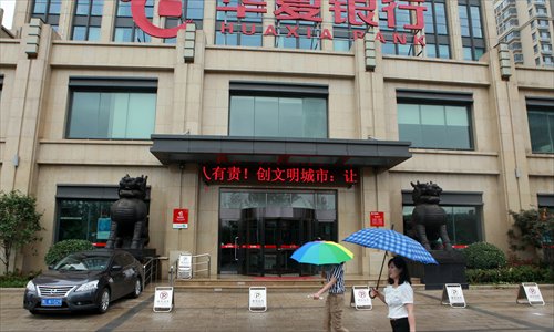 Two passengers walk past an office of Huaxia Bank in Rizhao, East China's Shandong Province on June 26. Photo: CFP