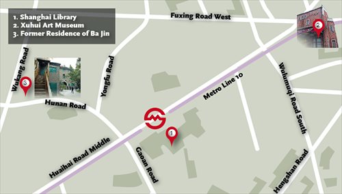 Emerging from exit 3 of the station and walking along Gaoan Road to Hunan Road for about 10 minutes will bring you to the former residence of Ba Jin (113 Wukang Road, 3368-5656) near the junction of Hunan Road and Wukang Road. It opens from 10 am to 4 pm, Tuesday to Sunday and admission is free.