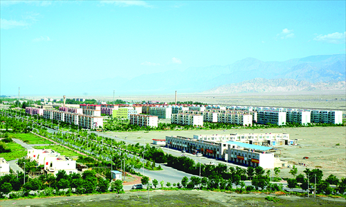 After hours of driving along the highway from Korla to Luntai in the Bayingol Mongolian Autonomous Prefecture, located in southern Xinjiang, rows of modern apartments gleaming with white paint suddenly appear to break up the monotonous landscape in the Gobi Desert.