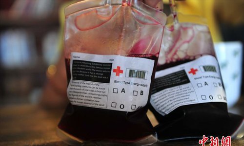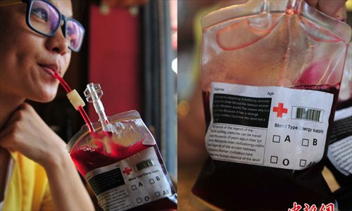 A girl tastes drink in a blood bag at a café in Benxi, Northeast China's Liaoning province on July 6, 2014. The café serves blueberry juice and cranberry juice in medical blood bags to let the customers experience what it will be like to be a vampire. One "blood bag" costs 60 yuan (about 10 US dollars), attracting many younger customers. (CNS/Yu Haiyang)