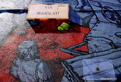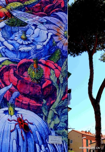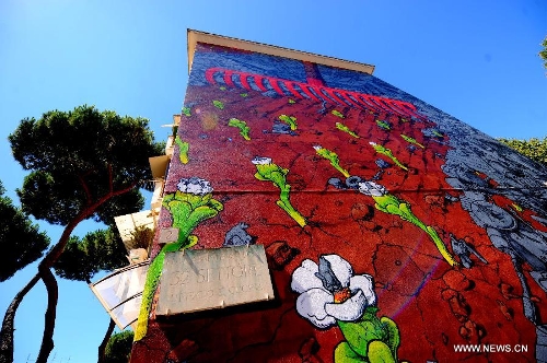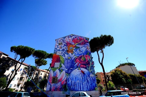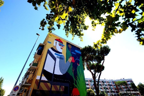 Photo taken on July 15 shows the mural created by Italian muralist Agostino Iacurci in San Basilio community of Rome, Italy. Italian capital Rome has launched a project to turn the city into a street arts center. Spanish street muralist Liqen and Italian street muralist Agostino Iacurci have finished murals on four facades in San Basilio community on eastern outskirts of Rome. More neighborhoods in Rome will be decorated in the future. (Xinhua/Xu Nizhi)