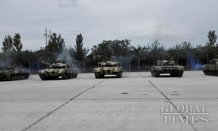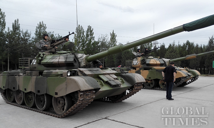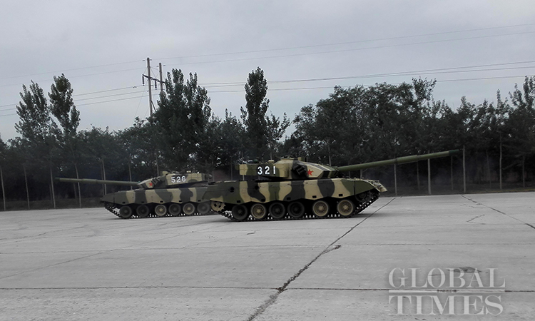 Two tanks are on the vehicle driving demonstration at AAFE on July 22, 2014. Photo: Pang Qi /GT