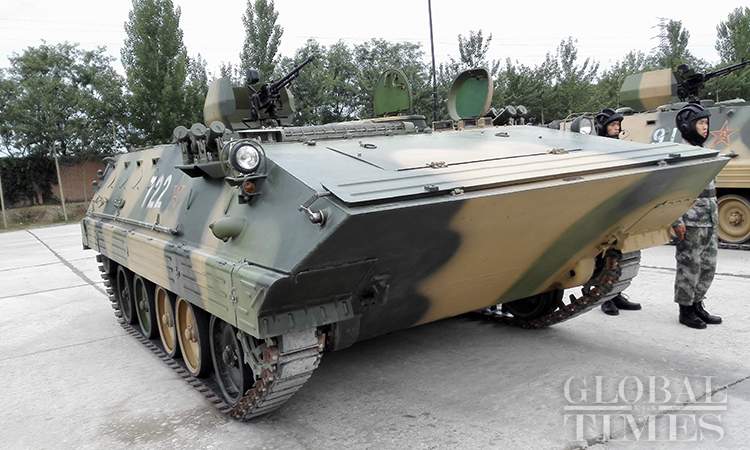 A Type-89 Armored Carrier is displayed at the AAFE in Beijing on July 22, 2014. The carrier can carry 13 passengers and two crew members. The Type 89 is designed to help coordinate with tanks in combat and support dismounted infantry with firepower. Photo: Pang Qi /GT