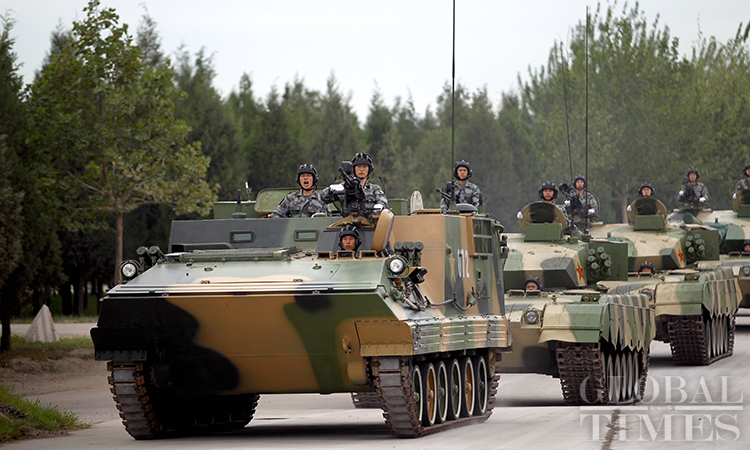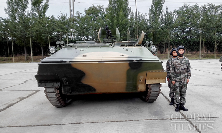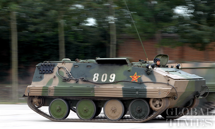 Cadets stand next to a Type-89 Armored Carrier at the Academy of Armored Forces Engineering (AAFE) in Beijing on July 22, 2014. The Type-89 Armored Carrier, a second generation tracked armored carrier, was developed and produced independently in China and deployed in 1989. Photo: Pang Qi /GT
