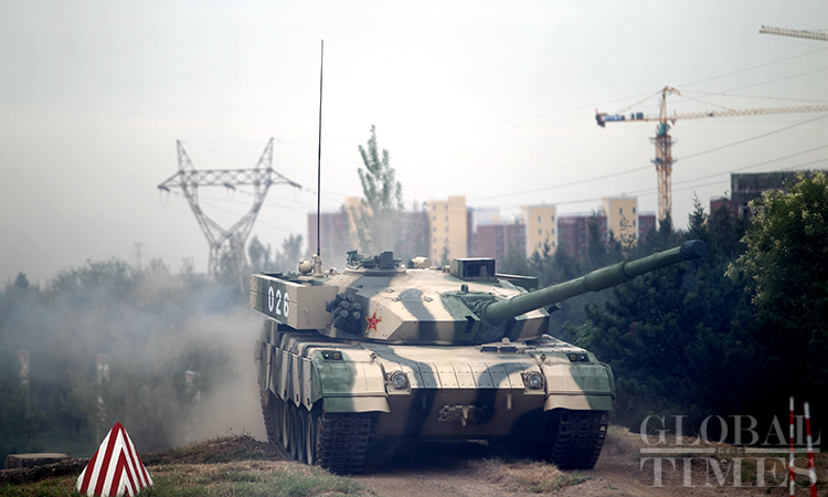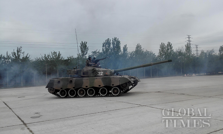 A tank is on the vehicle driving demonstration at AAFE on July 22, 2014. Photo: Pang Qi /GT