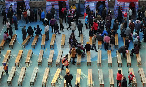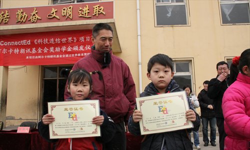 Children of migrant workers at a school in Daxing district, Beijing, receive a scholarship awarded by a French foundation and a US NGO on March 2, 2012. Photo: CFP
