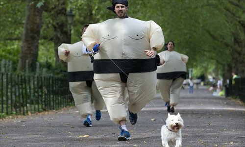 A participant runs with his dog as they take part in the Sumo Run in Battersea Park, London, on Sunday. The Sumo Run is an annual 5 kilometers charity fun run around the park in inflatable sumo suits. Photo: AFP