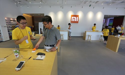 A customer asks about a phone at a Xiaomi after-sales center in Beijing on June 27. Photo: CFP