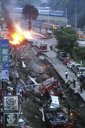 Gas leaks were reported in the city's Cianjhen District at 8:46 pm on Thursday, leading to multiple blasts that affected a three square km area, overturning cars and ripping up roads.