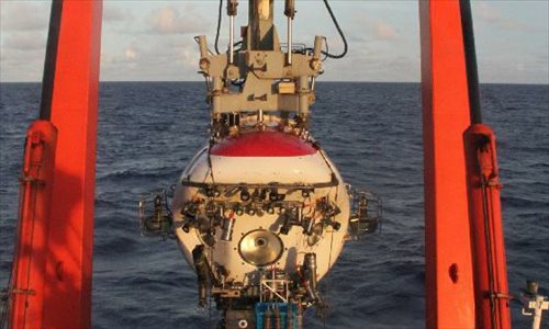 China's manned deep-sea submersible Jiaolong took a torch of the Youth Olympics to be held in China to the deep sea on Saturday in the northwest Pacific Ocean.Photo: Xinhua