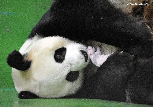 Giant panda "Ju Xiao" holds a panda cub in her arms in Guangzhou, capital of south China's Guangdong Province, Aug. 10, 2014. Giant panda "Ju Xiao" gave birth to three panda cubs on July 29. The three panda cubs are the first alive giant panda triplets in the world. (Xinhua)