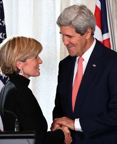 US Secretary of State John Kerry shakes hands with Australian Foreign Minister Julie Bishop after a press conference at the conclusion of the Australia-US Ministerial Consultations at Admiralty House in Sydney on Tuesday. Photo: AFP