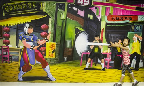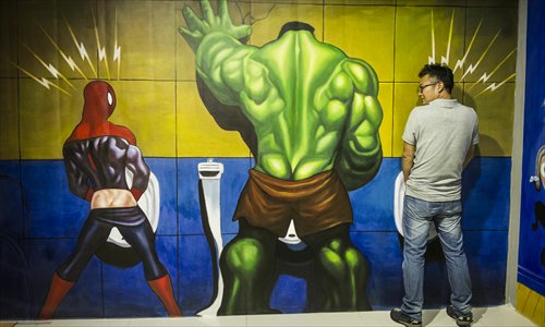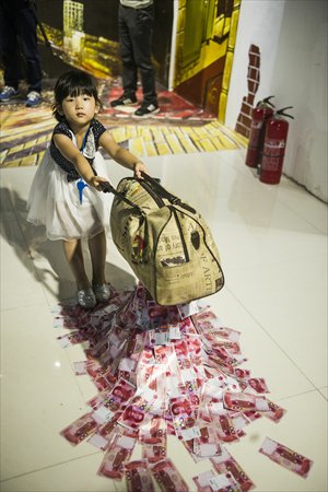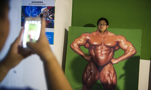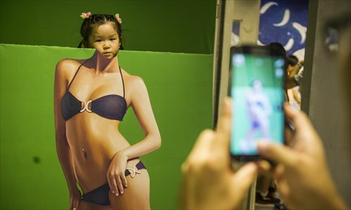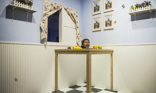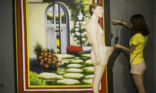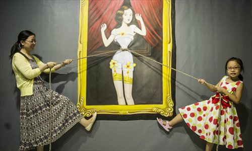 A little girl poses for a photo from behind a bikini-clad body at the newly-opened Beijing 3D Art Museum on August 16. Among the museum's exhibitions, visitors can also experience 3D with interactive installations. Photos: Li Hao/GT