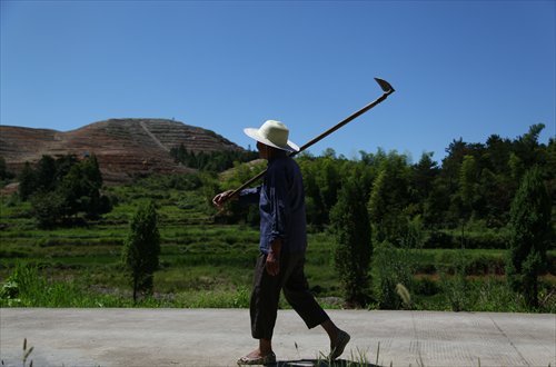 A farmer walks at the foot of the mountains. Photo: Tencent News, Greenpeace