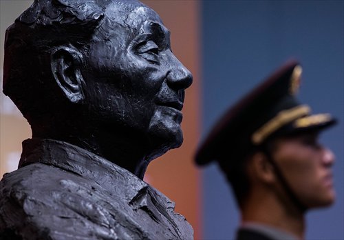 A soldier stands in front of a sculpture featuring late Chinese leader Deng Xiaoping during the Exhibition of the 110th Anniversary of the Birth of Deng Xiaoping on Thursday in Hong Kong. Deng implemented a "One Country, Two Systems" policy on the sovereignty issues of Hong Kong and Macau. Photo: CFP