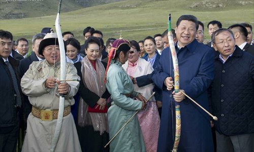 Chinese President Xi Jinping and Mongolian President Tsakhiagiin Elbegdorj prepare to shoot arrows while they watch "Nadam Fair ", a traditional Mongolian pageant for entertainment and games, in Ulan Bator, Mongolia, August 22, 2014. Photo: Xinhua