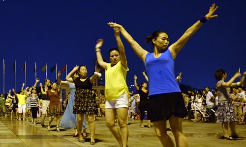A dance group gets together at a public park in Shenzhen, Guangdong Province, for some evening dancing on August 3. Photo: CFP