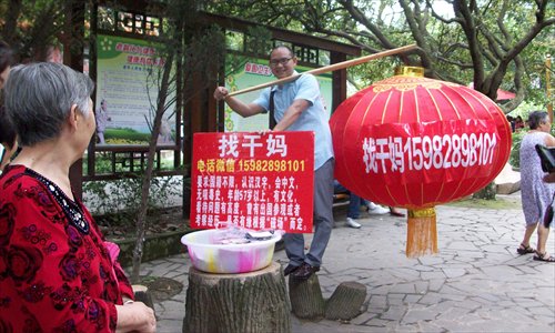 A man offers 1 million yuan ($162,000) to the qualified woman willing to be his adopted mother in Fanghu Park, Sichuan Province, on Saturday. Photo: IC