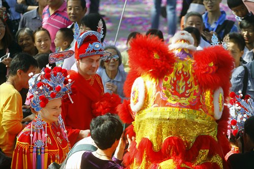 A lion dance welcomes one of the wedding couples. Photo: Yang Hui/GT