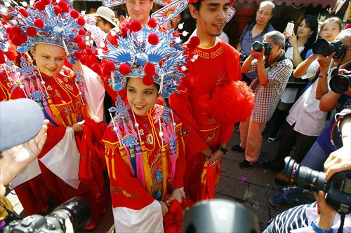Ten small wooden boats glided along the river as fireworks echoed around them. Clad in ornate red Chinese wedding costumes, 20 couples, mostly foreigners, waved cheerfully to the people on the banks as they cruised past.