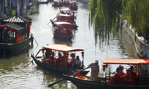 Wooden riverboats carrying wedding groups glide along a waterway in Fengjing town. Photo: Yang Hui/GT