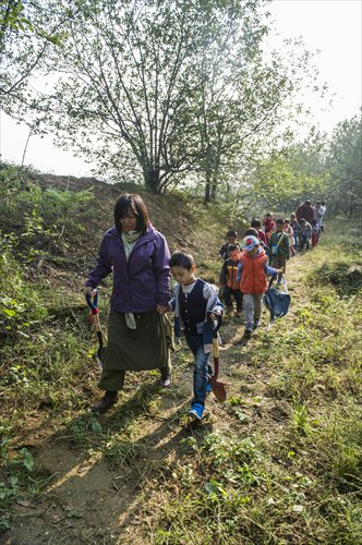 Preschool students at the school on their way to an organic farm not far from the school grounds. Photo: Li Hao/GT