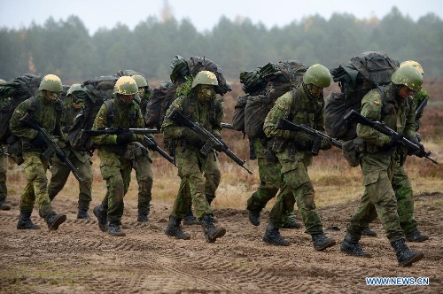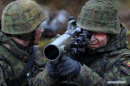 Lithuanian soldiers attend the "Hunter 2014" meida day training in Pabrade, Lithuania, on Oct. 16, 2014. Lithuania started a two-week anti-tank exercise "Hunter 2014" from Oct. 6, gathering more than 200 military personnels from the US and Lithuania. (Xinhua/Alfredas Pliadis)