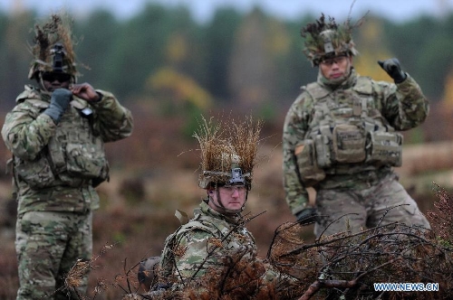US soldiers attend the "Hunter 2014" meida day training in Pabrade, Lithuania, on Oct. 16, 2014. Lithuania started a two-week anti-tank exercise "Hunter 2014" from Oct. 6, gathering more than 200 military personnels from the US and Lithuania. (Xinhua/Alfredas Pliadis)