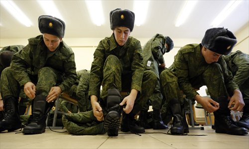 Conscripts lace their boots after receiving their uniforms. In line with Russian law, able-bodied men aged 18-27 must serve 12 months in the Armed Forces, lowered from 18 months in 2008. There are a number of exemptions, including for single parents, some students and those who are ill. Photo: IC