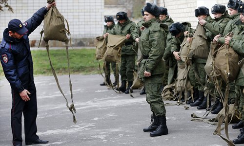 Russian conscripts wait to receive their military uniforms at a recruiting station in the town of Bataisk on Monday. More than 150,000 young Russians will be called up for compulsory military service this fall, according to the Moscow Times. Photo: IC