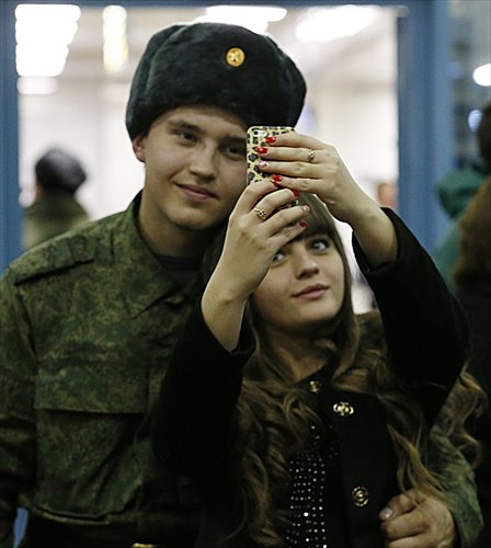 A conscript hugs his girlfriend on Sunday during a send-off ceremony at a local train station. Recruits from Russia's Southern Military District are entering into military service. This round of conscripts will serve within Russian airborne units, marines and army brigades. Photo: CFP
