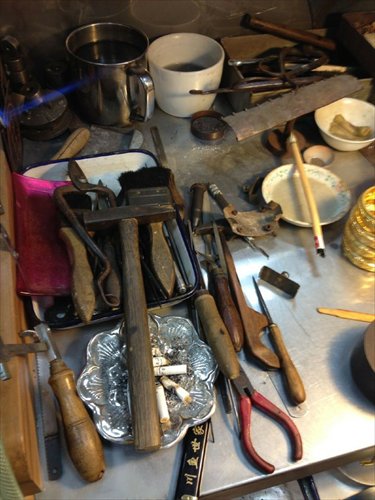 Sometimes the craftspeople must create their own tools to fulfill specific tasks, or customize existing tools. Huang has used a spoon with its tip cutoff as a tool for smoothing the edge of his bracelets. "Learning to use the tools properly is of vital importance, and is also a touchstone for testing the skills of a crafter," he said.