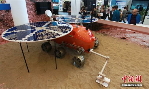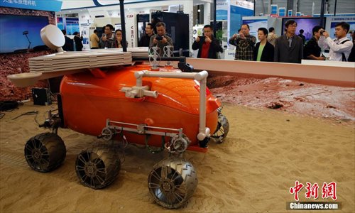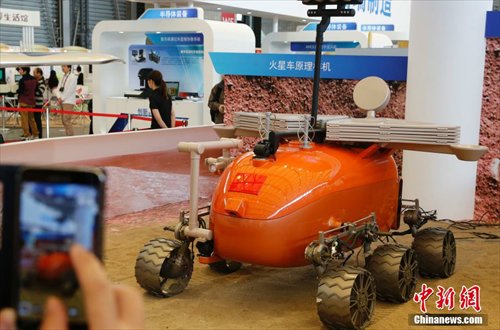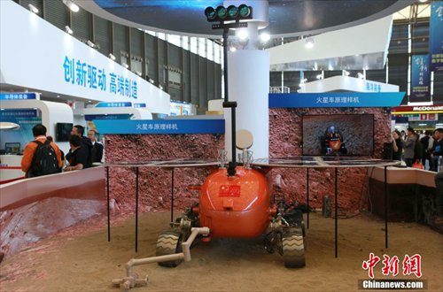The sample machine of China’s Mars rover attracts eyeballs of visitors at 2014 China International Industry Fair in Shanghai on Nov.4, 2014. Based on technology of moon rover "Jade Rabbit", Shanghai Aerospace Systems Engineering Research Institute along with other foreign institutes undertook the research work of Mars rover and developed numerous types of digital sample machine. (CNS/Tang Yanjun)