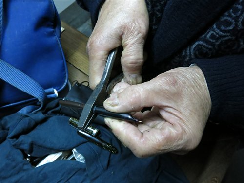 However, business is hardly booming. "Sometimes, I can wait for two or three weeks before a customer appears," said Xun. The old man has a short and slightly bent figure but speaks clearly and has an intelligent face. His rough hands show that he did heavy manual work for years. From the 1960s to 1990s, he worked at a steel factory as a fitter.