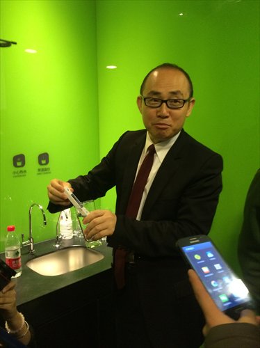 SOHO China Chairman Pan Shiyi tests the quality of the tap water of a SOHO building on Wednesday. Photo: Zhao Qian/GT