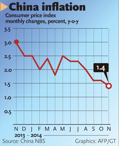 The consumer price index (CPI), the main gauge of inflation, increased by 1.4 percent in November from the previous year, its lowest reading since November 2009, according to data released by the National Bureau of Statistics (NBS) on Wednesday.