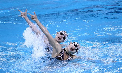 Chinese swimmers perform during the ninth FINA Synchronized Swimming World Trophy at the Ying Tung Natatorium in Beijing on Sunday. Photo: Cui Meng/GT