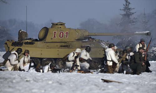 Actors in period German uniforms take cover behind a German Jagpanther tank destroyer as they take part in the re-enactment of the 70th anniversary of the Battle of the Ardennes, also known as the Ardennes Counteroffensive or the Battle of the Bulge, on Sunday in Recogne, Belgium. The battle, fought over the winter months of 1944 to 1945, was the last major German offensive against the Allies in World War II. Photo: AFP