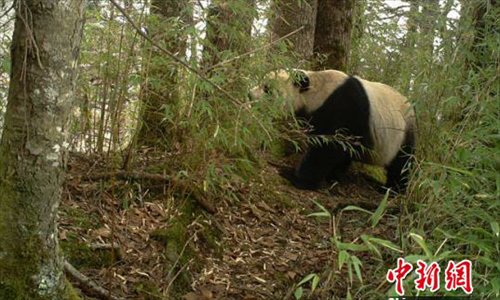 A rare wild panda is caught on film with an infrared camera at Baishuijiang National Nature Reserve in Longnan, Gansu Province. According to He Liwen, an employee at the reserve, a total 80 cameras installed throughout the area have captured 19 photos of wild giant pandas, all of which reveal the pandas to be in good health. Photo: Courtesy of Baishuijiang National Nature Reserve/Chinanews.com
